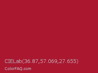 CIELab 36.87,57.069,27.655 Color is a normal red color and the nearest color is Upsdell Red #ae2029. Hex code #ab172e and RGB value is rgb(171,23,46). In RGB color space, this color is composed of 67% red, 9% green, 18% blue, In CMYK color space, this color is composed of 0% cyan, 87% magenta, 73% yellow , 33% black , In HSL color space, this color has a hue angle of 351° , 76% saturation and 38% lightness.