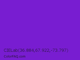CIELab 36.884,67.922,-73.797 Color is a normal violet color and the nearest color is French Violet #8806ce. Hex code #781dd1 and RGB value is rgb(120,29,209). In RGB color space, this color is composed of 47% red, 11% green, 82% blue, In CMYK color space, this color is composed of 43% cyan, 86% magenta, 0% yellow , 18% black , In HSL color space, this color has a hue angle of 270° , 76% saturation and 47% lightness.