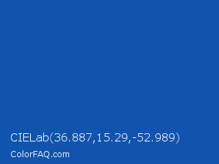 CIELab 36.887,15.29,-52.989 Color is a normal blue color and the nearest color is Tory Blue #1450aa. Hex code #1154ad and RGB value is rgb(17,84,173). In RGB color space, this color is composed of 7% red, 33% green, 68% blue, In CMYK color space, this color is composed of 90% cyan, 51% magenta, 0% yellow , 32% black , In HSL color space, this color has a hue angle of 214° , 82% saturation and 37% lightness.