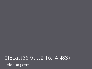 CIELab 36.911,2.16,-4.483 Color is a normal indigo color and the nearest color is Scarpa Flow #585562. Hex code #57565e and RGB value is rgb(87,86,94). In RGB color space, this color is composed of 34% red, 34% green, 37% blue, In CMYK color space, this color is composed of 7% cyan, 9% magenta, 0% yellow , 63% black , In HSL color space, this color has a hue angle of 248° , 4% saturation and 35% lightness.