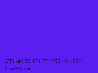 CIELab 36.921,72.263,-91.592 Color is a normal indigo color and the nearest color is Han Purple #5218fa. Hex code #5c1ef0 and RGB value is rgb(92,30,240). In RGB color space, this color is composed of 36% red, 12% green, 94% blue, In CMYK color space, this color is composed of 62% cyan, 88% magenta, 0% yellow , 6% black , In HSL color space, this color has a hue angle of 258° , 88% saturation and 53% lightness.