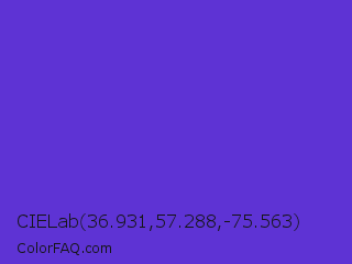 CIELab 36.931,57.288,-75.563 Color is a normal indigo color and the nearest color is Purple Heart Crayola #652dc1. Hex code #5e33d4 and RGB value is rgb(94,51,212). In RGB color space, this color is composed of 37% red, 20% green, 83% blue, In CMYK color space, this color is composed of 56% cyan, 76% magenta, 0% yellow , 17% black , In HSL color space, this color has a hue angle of 256° , 65% saturation and 52% lightness.
