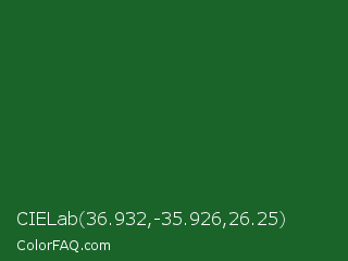 CIELab 36.932,-35.926,26.25 Color is a dark green color and the nearest color is Mughal Green #306030. Hex code #1a642a and RGB value is rgb(26,100,42). In RGB color space, this color is composed of 10% red, 39% green, 16% blue, In CMYK color space, this color is composed of 74% cyan, 0% magenta, 58% yellow , 61% black , In HSL color space, this color has a hue angle of 133° , 59% saturation and 25% lightness.