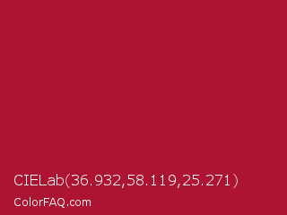 CIELab 36.932,58.119,25.271 Color is a normal red color and the nearest color is Shiraz #b20931. Hex code #ac1432 and RGB value is rgb(172,20,50). In RGB color space, this color is composed of 67% red, 8% green, 20% blue, In CMYK color space, this color is composed of 0% cyan, 88% magenta, 71% yellow , 33% black , In HSL color space, this color has a hue angle of 348° , 79% saturation and 38% lightness.