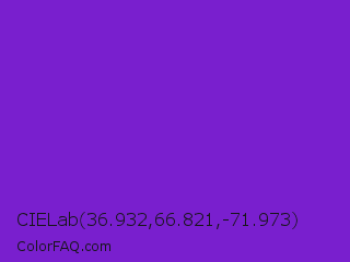 CIELab 36.932,66.821,-71.973 Color is a normal purple color and the nearest color is Purple Heart Crayola #652dc1. Hex code #791fce and RGB value is rgb(121,31,206). In RGB color space, this color is composed of 47% red, 12% green, 81% blue, In CMYK color space, this color is composed of 41% cyan, 85% magenta, 0% yellow , 19% black , In HSL color space, this color has a hue angle of 271° , 74% saturation and 46% lightness.