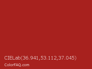 CIELab 36.941,53.112,37.045 Color is a normal red color and the nearest color is Mexican Red #a72525. Hex code #a8211e and RGB value is rgb(168,33,30). In RGB color space, this color is composed of 66% red, 13% green, 12% blue, In CMYK color space, this color is composed of 0% cyan, 80% magenta, 82% yellow , 34% black , In HSL color space, this color has a hue angle of 1° , 70% saturation and 39% lightness.