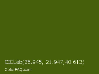 CIELab 36.945,-21.947,40.613 Color is a very dark lime color and the nearest color is Green Leaf #436a0d. Hex code #465f0a and RGB value is rgb(70,95,10). In RGB color space, this color is composed of 27% red, 37% green, 4% blue, In CMYK color space, this color is composed of 26% cyan, 0% magenta, 89% yellow , 63% black , In HSL color space, this color has a hue angle of 78° , 81% saturation and 21% lightness.