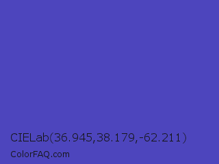 CIELab 36.945,38.179,-62.211 Color is a normal indigo color and the nearest color is Ocean Blue #4f42b5. Hex code #4d45bd and RGB value is rgb(77,69,189). In RGB color space, this color is composed of 30% red, 27% green, 74% blue, In CMYK color space, this color is composed of 59% cyan, 63% magenta, 0% yellow , 26% black , In HSL color space, this color has a hue angle of 244° , 48% saturation and 51% lightness.