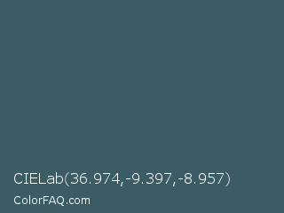 CIELab 36.974,-9.397,-8.957 Color is a normal cyan color and the nearest color is Fiord #405169. Hex code #3b5c65 and RGB value is rgb(59,92,101). In RGB color space, this color is composed of 23% red, 36% green, 40% blue, In CMYK color space, this color is composed of 42% cyan, 9% magenta, 0% yellow , 60% black , In HSL color space, this color has a hue angle of 193° , 26% saturation and 31% lightness.