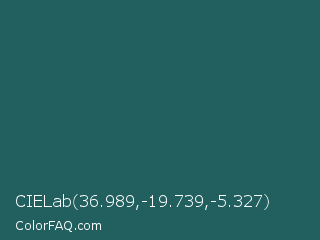 CIELab 36.989,-19.739,-5.327 Color is a dark cyan color and the nearest color is Casal #2f6168. Hex code #22605f and RGB value is rgb(34,96,95). In RGB color space, this color is composed of 13% red, 38% green, 37% blue, In CMYK color space, this color is composed of 65% cyan, 0% magenta, 1% yellow , 62% black , In HSL color space, this color has a hue angle of 179° , 48% saturation and 25% lightness.