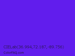 CIELab 36.994,72.187,-89.756 Color is a normal indigo color and the nearest color is Han Purple #5218fa. Hex code #611ded and RGB value is rgb(97,29,237). In RGB color space, this color is composed of 38% red, 11% green, 93% blue, In CMYK color space, this color is composed of 59% cyan, 88% magenta, 0% yellow , 7% black , In HSL color space, this color has a hue angle of 260° , 85% saturation and 52% lightness.