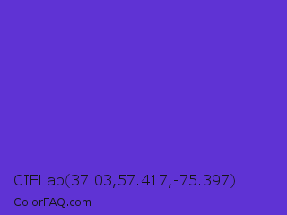 CIELab 37.03,57.417,-75.397 Color is a normal indigo color and the nearest color is Purple Heart Crayola #652dc1. Hex code #5f33d4 and RGB value is rgb(95,51,212). In RGB color space, this color is composed of 37% red, 20% green, 83% blue, In CMYK color space, this color is composed of 55% cyan, 76% magenta, 0% yellow , 17% black , In HSL color space, this color has a hue angle of 256° , 65% saturation and 52% lightness.