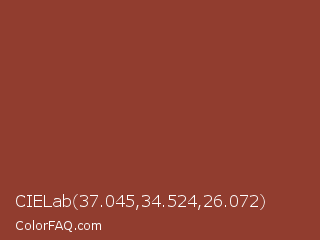 CIELab 37.045,34.524,26.072 Color is a normal red color and the nearest color is El Salva #8f3e33. Hex code #913d2f and RGB value is rgb(145,61,47). In RGB color space, this color is composed of 57% red, 24% green, 18% blue, In CMYK color space, this color is composed of 0% cyan, 58% magenta, 68% yellow , 43% black , In HSL color space, this color has a hue angle of 9° , 51% saturation and 38% lightness.