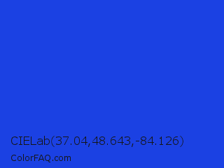 CIELab 37.04,48.643,-84.126 Color is a normal blue color and the nearest color is Palatinate Blue #273be2. Hex code #1b41e3 and RGB value is rgb(27,65,227). In RGB color space, this color is composed of 11% red, 25% green, 89% blue, In CMYK color space, this color is composed of 88% cyan, 71% magenta, 0% yellow , 11% black , In HSL color space, this color has a hue angle of 229° , 79% saturation and 50% lightness.