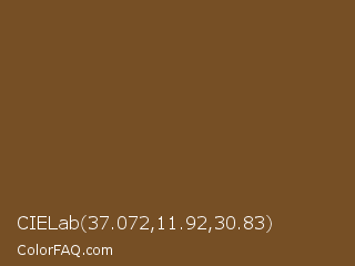 CIELab 37.072,11.92,30.83 Color is a dark orange color and the nearest color is Dallas #6e4b26. Hex code #764f25 and RGB value is rgb(118,79,37). In RGB color space, this color is composed of 46% red, 31% green, 15% blue, In CMYK color space, this color is composed of 0% cyan, 33% magenta, 69% yellow , 54% black , In HSL color space, this color has a hue angle of 31° , 52% saturation and 30% lightness.