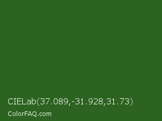 CIELab 37.089,-31.928,31.73 Color is a dark green color and the nearest color is Mughal Green #306030. Hex code #2d6320 and RGB value is rgb(45,99,32). In RGB color space, this color is composed of 18% red, 39% green, 13% blue, In CMYK color space, this color is composed of 55% cyan, 0% magenta, 68% yellow , 61% black , In HSL color space, this color has a hue angle of 108° , 51% saturation and 26% lightness.