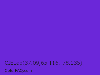 CIELab 37.09,65.116,-78.135 Color is a normal violet color and the nearest color is Purple Heart Crayola #652dc1. Hex code #6b27d9 and RGB value is rgb(107,39,217). In RGB color space, this color is composed of 42% red, 15% green, 85% blue, In CMYK color space, this color is composed of 51% cyan, 82% magenta, 0% yellow , 15% black , In HSL color space, this color has a hue angle of 263° , 70% saturation and 50% lightness.