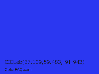 CIELab 37.109,59.483,-91.943 Color is a normal blue color and the nearest color is Palatinate Blue #273be2. Hex code #2b37f1 and RGB value is rgb(43,55,241). In RGB color space, this color is composed of 17% red, 22% green, 95% blue, In CMYK color space, this color is composed of 82% cyan, 77% magenta, 0% yellow , 5% black , In HSL color space, this color has a hue angle of 236° , 88% saturation and 56% lightness.