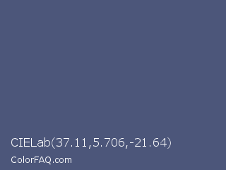 CIELab 37.11,5.706,-21.64 Color is a normal blue color and the nearest color is Purple Navy #4e5180. Hex code #4c567a and RGB value is rgb(76,86,122). In RGB color space, this color is composed of 30% red, 34% green, 48% blue, In CMYK color space, this color is composed of 38% cyan, 30% magenta, 0% yellow , 52% black , In HSL color space, this color has a hue angle of 227° , 23% saturation and 39% lightness.