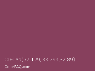 CIELab 37.129,33.794,-2.89 Color is a normal rose color and the nearest color is Deep Ruby #843f5b. Hex code #87405d and RGB value is rgb(135,64,93). In RGB color space, this color is composed of 53% red, 25% green, 36% blue, In CMYK color space, this color is composed of 0% cyan, 53% magenta, 31% yellow , 47% black , In HSL color space, this color has a hue angle of 335° , 36% saturation and 39% lightness.