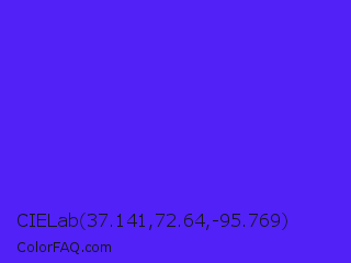 CIELab 37.141,72.64,-95.769 Color is a normal indigo color and the nearest color is Han Purple #5218fa. Hex code #5121f8 and RGB value is rgb(81,33,248). In RGB color space, this color is composed of 32% red, 13% green, 97% blue, In CMYK color space, this color is composed of 67% cyan, 87% magenta, 0% yellow , 3% black , In HSL color space, this color has a hue angle of 253° , 94% saturation and 55% lightness.