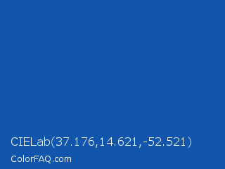 CIELab 37.176,14.621,-52.521 Color is a normal blue color and the nearest color is Tory Blue #1450aa. Hex code #1155ad and RGB value is rgb(17,85,173). In RGB color space, this color is composed of 7% red, 33% green, 68% blue, In CMYK color space, this color is composed of 90% cyan, 51% magenta, 0% yellow , 32% black , In HSL color space, this color has a hue angle of 214° , 82% saturation and 37% lightness.