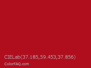 CIELab 37.185,59.453,37.856 Color is a normal red color and the nearest color is Carnelian #b31b1b. Hex code #b00e1e and RGB value is rgb(176,14,30). In RGB color space, this color is composed of 69% red, 5% green, 12% blue, In CMYK color space, this color is composed of 0% cyan, 92% magenta, 83% yellow , 31% black , In HSL color space, this color has a hue angle of 354° , 85% saturation and 37% lightness.