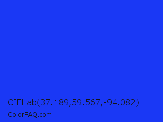CIELab 37.189,59.567,-94.082 Color is a normal blue color and the nearest color is Palatinate Blue #273be2. Hex code #1a38f5 and RGB value is rgb(26,56,245). In RGB color space, this color is composed of 10% red, 22% green, 96% blue, In CMYK color space, this color is composed of 89% cyan, 77% magenta, 0% yellow , 4% black , In HSL color space, this color has a hue angle of 232° , 92% saturation and 53% lightness.