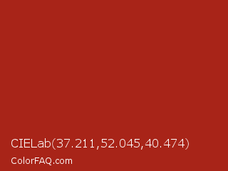 CIELab 37.211,52.045,40.474 Color is a normal red color and the nearest color is Tabasco #a02712. Hex code #a82418 and RGB value is rgb(168,36,24). In RGB color space, this color is composed of 66% red, 14% green, 9% blue, In CMYK color space, this color is composed of 0% cyan, 79% magenta, 86% yellow , 34% black , In HSL color space, this color has a hue angle of 5° , 75% saturation and 38% lightness.