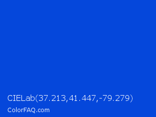 CIELab 37.213,41.447,-79.279 Color is a normal blue color and the nearest color is Absolute Zero #0048ba. Hex code #0547db and RGB value is rgb(5,71,219). In RGB color space, this color is composed of 2% red, 28% green, 86% blue, In CMYK color space, this color is composed of 98% cyan, 68% magenta, 0% yellow , 14% black , In HSL color space, this color has a hue angle of 221° , 96% saturation and 44% lightness.
