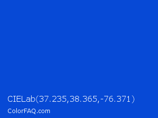 CIELab 37.235,38.365,-76.371 Color is a normal blue color and the nearest color is Absolute Zero #0048ba. Hex code #0749d6 and RGB value is rgb(7,73,214). In RGB color space, this color is composed of 3% red, 29% green, 84% blue, In CMYK color space, this color is composed of 97% cyan, 66% magenta, 0% yellow , 16% black , In HSL color space, this color has a hue angle of 221° , 94% saturation and 43% lightness.