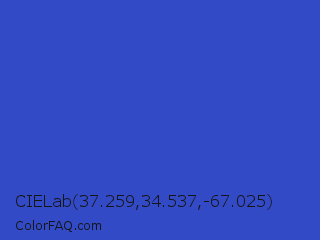 CIELab 37.259,34.537,-67.025 Color is a normal blue color and the nearest color is Cerulean Blue #2a52be. Hex code #334ac6 and RGB value is rgb(51,74,198). In RGB color space, this color is composed of 20% red, 29% green, 78% blue, In CMYK color space, this color is composed of 74% cyan, 63% magenta, 0% yellow , 22% black , In HSL color space, this color has a hue angle of 231° , 59% saturation and 49% lightness.