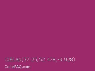 CIELab 37.25,52.478,-9.928 Color is a normal magenta color and the nearest color is Amaranth Deep Purple #9f2b68. Hex code #9c2969 and RGB value is rgb(156,41,105). In RGB color space, this color is composed of 61% red, 16% green, 41% blue, In CMYK color space, this color is composed of 0% cyan, 74% magenta, 33% yellow , 39% black , In HSL color space, this color has a hue angle of 327° , 58% saturation and 39% lightness.
