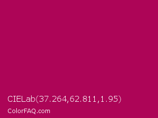 CIELab 37.264,62.811,1.95 Color is a normal rose color and the nearest color is Lipstick #ab0563. Hex code #ad0557 and RGB value is rgb(173,5,87). In RGB color space, this color is composed of 68% red, 2% green, 34% blue, In CMYK color space, this color is composed of 0% cyan, 97% magenta, 50% yellow , 32% black , In HSL color space, this color has a hue angle of 331° , 94% saturation and 35% lightness.