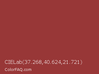 CIELab 37.268,40.624,21.721 Color is a normal red color and the nearest color is Stiletto #9c3336. Hex code #983737 and RGB value is rgb(152,55,55). In RGB color space, this color is composed of 60% red, 22% green, 22% blue, In CMYK color space, this color is composed of 0% cyan, 64% magenta, 64% yellow , 40% black , In HSL color space, this color has a hue angle of 0° , 47% saturation and 41% lightness.