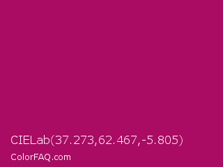 CIELab 37.273,62.467,-5.805 Color is a normal magenta color and the nearest color is Lipstick #ab0563. Hex code #aa0b63 and RGB value is rgb(170,11,99). In RGB color space, this color is composed of 67% red, 4% green, 39% blue, In CMYK color space, this color is composed of 0% cyan, 94% magenta, 42% yellow , 33% black , In HSL color space, this color has a hue angle of 327° , 88% saturation and 35% lightness.