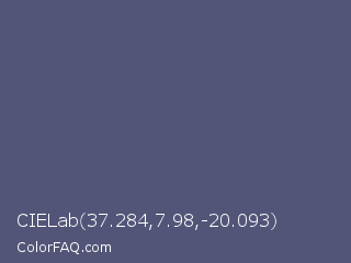 CIELab 37.284,7.98,-20.093 Color is a normal blue color and the nearest color is Purple Navy #4e5180. Hex code #535578 and RGB value is rgb(83,85,120). In RGB color space, this color is composed of 33% red, 33% green, 47% blue, In CMYK color space, this color is composed of 31% cyan, 29% magenta, 0% yellow , 53% black , In HSL color space, this color has a hue angle of 237° , 18% saturation and 40% lightness.