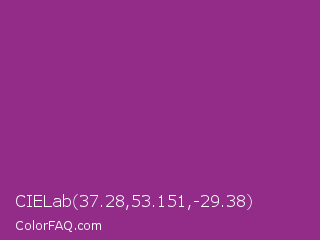 CIELab 37.28,53.151,-29.38 Color is a normal magenta color and the nearest color is Razzmic Berry Crayola #843179. Hex code #922c88 and RGB value is rgb(146,44,136). In RGB color space, this color is composed of 57% red, 17% green, 53% blue, In CMYK color space, this color is composed of 0% cyan, 70% magenta, 7% yellow , 43% black , In HSL color space, this color has a hue angle of 306° , 54% saturation and 37% lightness.