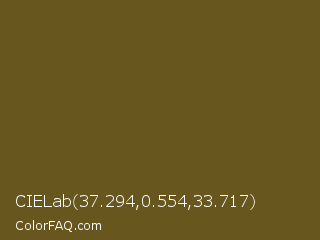 CIELab 37.294,0.554,33.717 Color is a dark orange color and the nearest color is Field Drab #6c541e. Hex code #68561f and RGB value is rgb(104,86,31). In RGB color space, this color is composed of 41% red, 34% green, 12% blue, In CMYK color space, this color is composed of 0% cyan, 17% magenta, 70% yellow , 59% black , In HSL color space, this color has a hue angle of 45° , 54% saturation and 26% lightness.