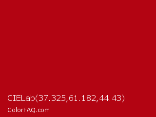 CIELab 37.325,61.182,44.43 Color is a normal red color and the nearest color is Bright Red #b10000. Hex code #b30412 and RGB value is rgb(179,4,18). In RGB color space, this color is composed of 70% red, 2% green, 7% blue, In CMYK color space, this color is composed of 0% cyan, 98% magenta, 90% yellow , 30% black , In HSL color space, this color has a hue angle of 355° , 96% saturation and 36% lightness.
