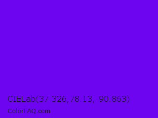 CIELab 37.326,78.13,-90.863 Color is a normal violet color and the nearest color is Electric Indigo #6f00ff. Hex code #6e05f0 and RGB value is rgb(110,5,240). In RGB color space, this color is composed of 43% red, 2% green, 94% blue, In CMYK color space, this color is composed of 54% cyan, 98% magenta, 0% yellow , 6% black , In HSL color space, this color has a hue angle of 267° , 96% saturation and 48% lightness.