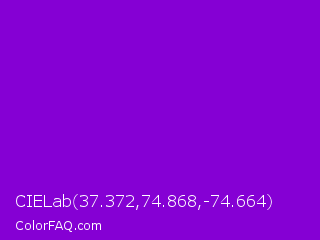 CIELab 37.372,74.868,-74.664 Color is a normal purple color and the nearest color is French Violet #8806ce. Hex code #8500d4 and RGB value is rgb(133,0,212). In RGB color space, this color is composed of 52% red, 0% green, 83% blue, In CMYK color space, this color is composed of 37% cyan, 100% magenta, 0% yellow , 17% black , In HSL color space, this color has a hue angle of 278° , 100% saturation and 42% lightness.