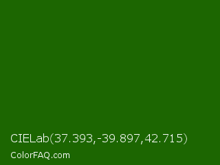 CIELab 37.393,-39.897,42.715 Color is a very dark green color and the nearest color is Lincoln Green #195905. Hex code #1c6601 and RGB value is rgb(28,102,1). In RGB color space, this color is composed of 11% red, 40% green, 0% blue, In CMYK color space, this color is composed of 73% cyan, 0% magenta, 99% yellow , 60% black , In HSL color space, this color has a hue angle of 104° , 98% saturation and 20% lightness.