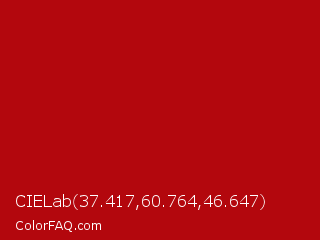 CIELab 37.417,60.764,46.647 Color is a normal red color and the nearest color is Milano Red #b81104. Hex code #b3070d and RGB value is rgb(179,7,13). In RGB color space, this color is composed of 70% red, 3% green, 5% blue, In CMYK color space, this color is composed of 0% cyan, 96% magenta, 93% yellow , 30% black , In HSL color space, this color has a hue angle of 358° , 92% saturation and 36% lightness.