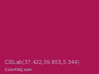 CIELab 37.422,59.853,5.344 Color is a normal rose color and the nearest color is Jazzberry Jam #a50b5e. Hex code #ab1452 and RGB value is rgb(171,20,82). In RGB color space, this color is composed of 67% red, 8% green, 32% blue, In CMYK color space, this color is composed of 0% cyan, 88% magenta, 52% yellow , 33% black , In HSL color space, this color has a hue angle of 335° , 79% saturation and 37% lightness.