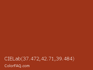 CIELab 37.472,42.71,39.484 Color is a normal red color and the nearest color is Cognac #9f381d. Hex code #9e3419 and RGB value is rgb(158,52,25). In RGB color space, this color is composed of 62% red, 20% green, 10% blue, In CMYK color space, this color is composed of 0% cyan, 67% magenta, 84% yellow , 38% black , In HSL color space, this color has a hue angle of 12° , 73% saturation and 36% lightness.