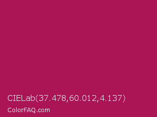 CIELab 37.478,60.012,4.137 Color is a normal rose color and the nearest color is Jazzberry Jam #a50b5e. Hex code #ab1454 and RGB value is rgb(171,20,84). In RGB color space, this color is composed of 67% red, 8% green, 33% blue, In CMYK color space, this color is composed of 0% cyan, 88% magenta, 51% yellow , 33% black , In HSL color space, this color has a hue angle of 335° , 79% saturation and 37% lightness.