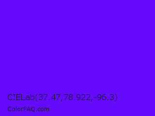 CIELab 37.47,78.922,-96.3 Color is a normal violet color and the nearest color is Electric Indigo #6f00ff. Hex code #630bfa and RGB value is rgb(99,11,250). In RGB color space, this color is composed of 39% red, 4% green, 98% blue, In CMYK color space, this color is composed of 60% cyan, 96% magenta, 0% yellow , 2% black , In HSL color space, this color has a hue angle of 262° , 96% saturation and 51% lightness.