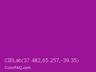 CIELab 37.482,65.257,-39.35 Color is a normal magenta color and the nearest color is Violet Eggplant #991199. Hex code #9c1299 and RGB value is rgb(156,18,153). In RGB color space, this color is composed of 61% red, 7% green, 60% blue, In CMYK color space, this color is composed of 0% cyan, 88% magenta, 2% yellow , 39% black , In HSL color space, this color has a hue angle of 301° , 79% saturation and 34% lightness.