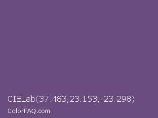 CIELab 37.483,23.153,-23.298 Color is a normal purple color and the nearest color is Cyber Grape #58427c. Hex code #6b4c7e and RGB value is rgb(107,76,126). In RGB color space, this color is composed of 42% red, 30% green, 49% blue, In CMYK color space, this color is composed of 15% cyan, 40% magenta, 0% yellow , 51% black , In HSL color space, this color has a hue angle of 277° , 25% saturation and 40% lightness.